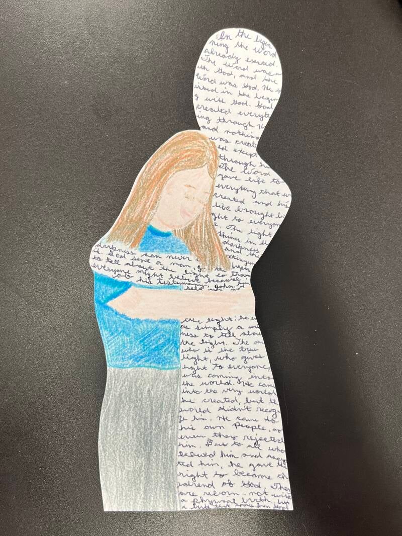 Scripture and artwork created with the students in the last few weeks of school. My sweet Aisla took part, she prays what what she calls our village and its important. Before I left to Texas I sat down with her and shared that a couple of her Unks were getting ready to head out to share Jesus in their gifting. Aisla's eyes got big and was concerned about the moms and their kids and who was going to care for the village while they are out Lita? We went into prayer and then I needed to share it was time for me to go as well. When I do get to talk with her we talk about prayer for the village and knowing how much God is with all of us no matter what. My granddaughter loved being apart of the class from a distance when she was able to and she loves praying for everyone including the students.